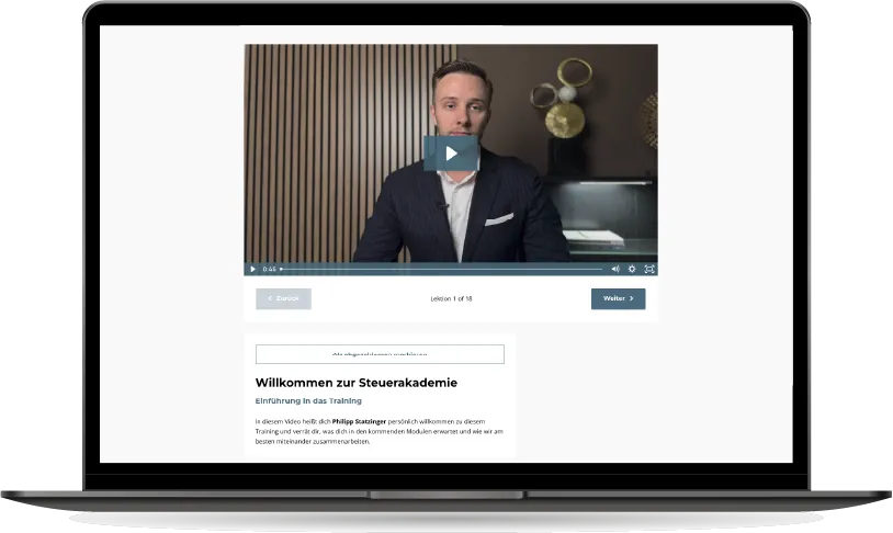 Für Mandanten ist ein kompletter Online-Kurs mit 6 Modulen und über 170 Lektionen inkludiert. Er vermittelt verständliche Grundlagen und klare Anleitungen für steuerliche Entscheidungen.